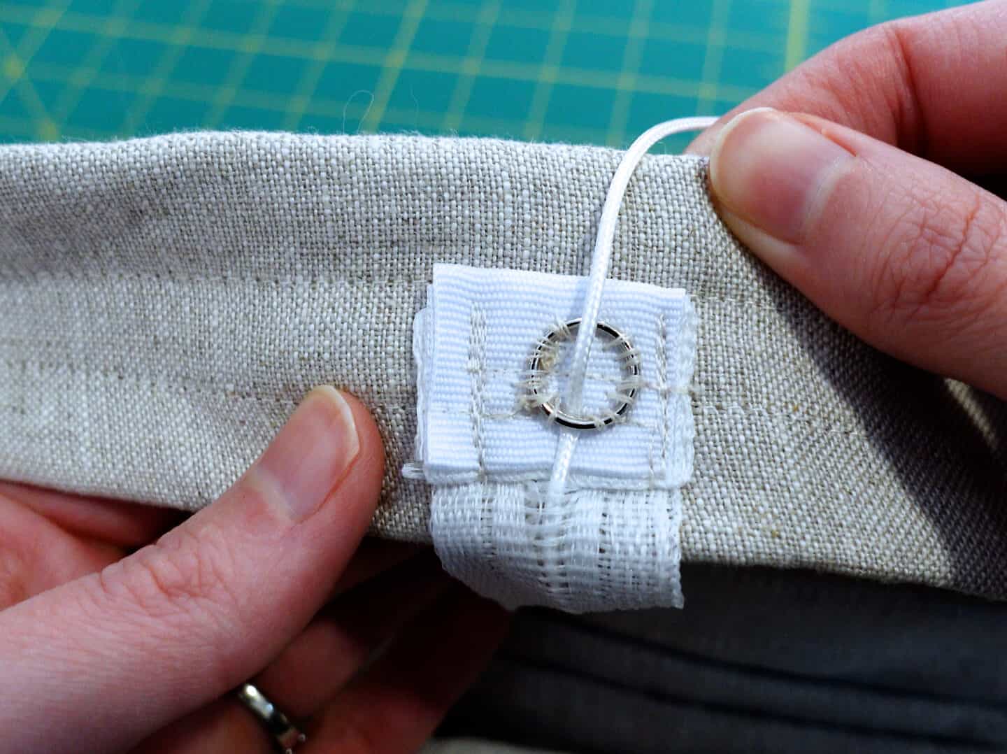- Attach lift cord to fabric just hemmed. Attach the lift cord by flipping the hemmed extra fabric out and sewing along the sides of the lift cord tape. This will ensure the sewing cannot be seen from the front.