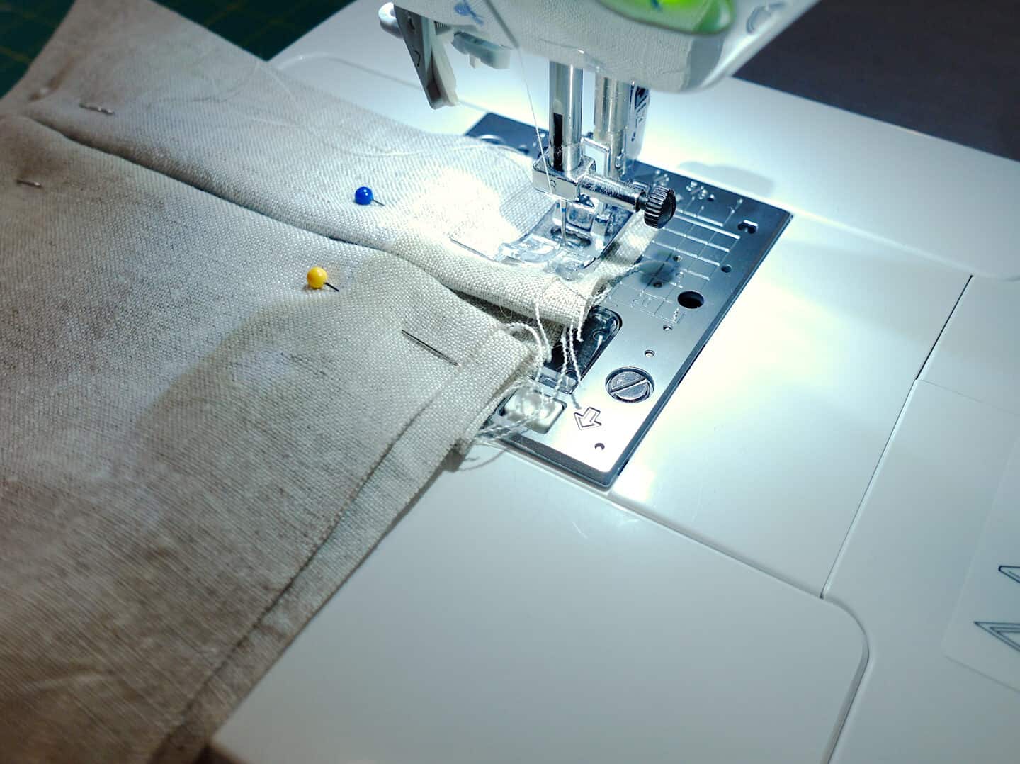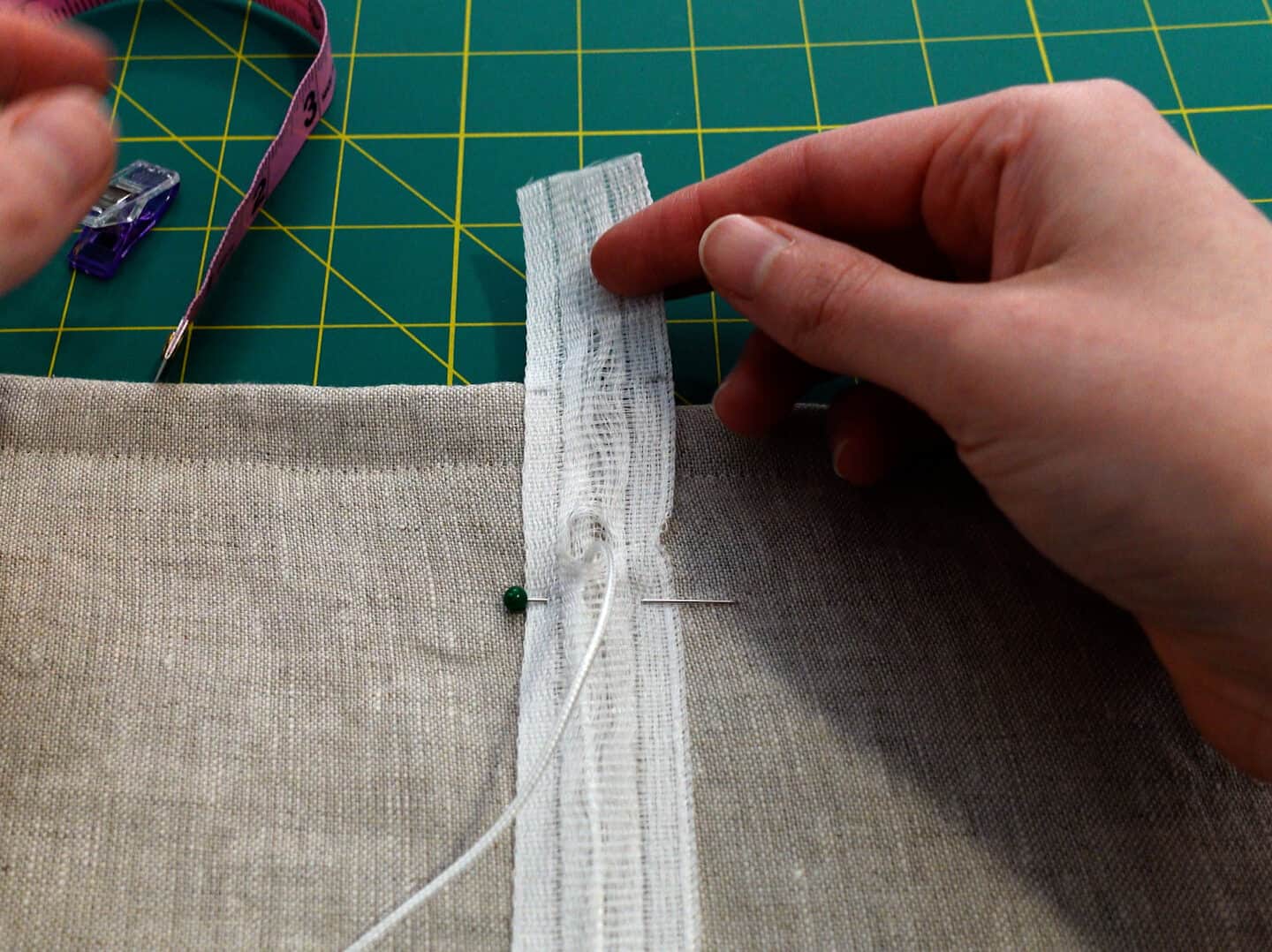 Now it’s time to make the pleats! These are really satisfying and easy to make. Mark where you want the center of the pleat to be (on the edge of the header board) and fold the fabric over 2″ on either side of the center. Pin, press, and zigzag stitch across the back of the fabric. My YouTube video covers this step pretty thoroughly if this isn’t making sense!