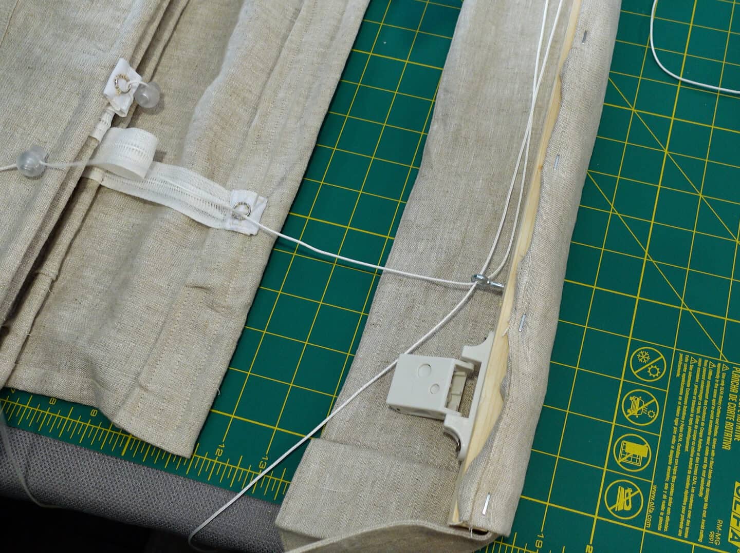 The rest of the shade assembly went the same as for a standard shade for the most part. Once the shade was up, I still saw the top plastic rod flipping forward too much, so I ended up sewing the top of the shade around the top-down lift cord for extra stability. This cord doesn’t move up and down inside the shade, but is stationary, so I thought it was the best way to add security.