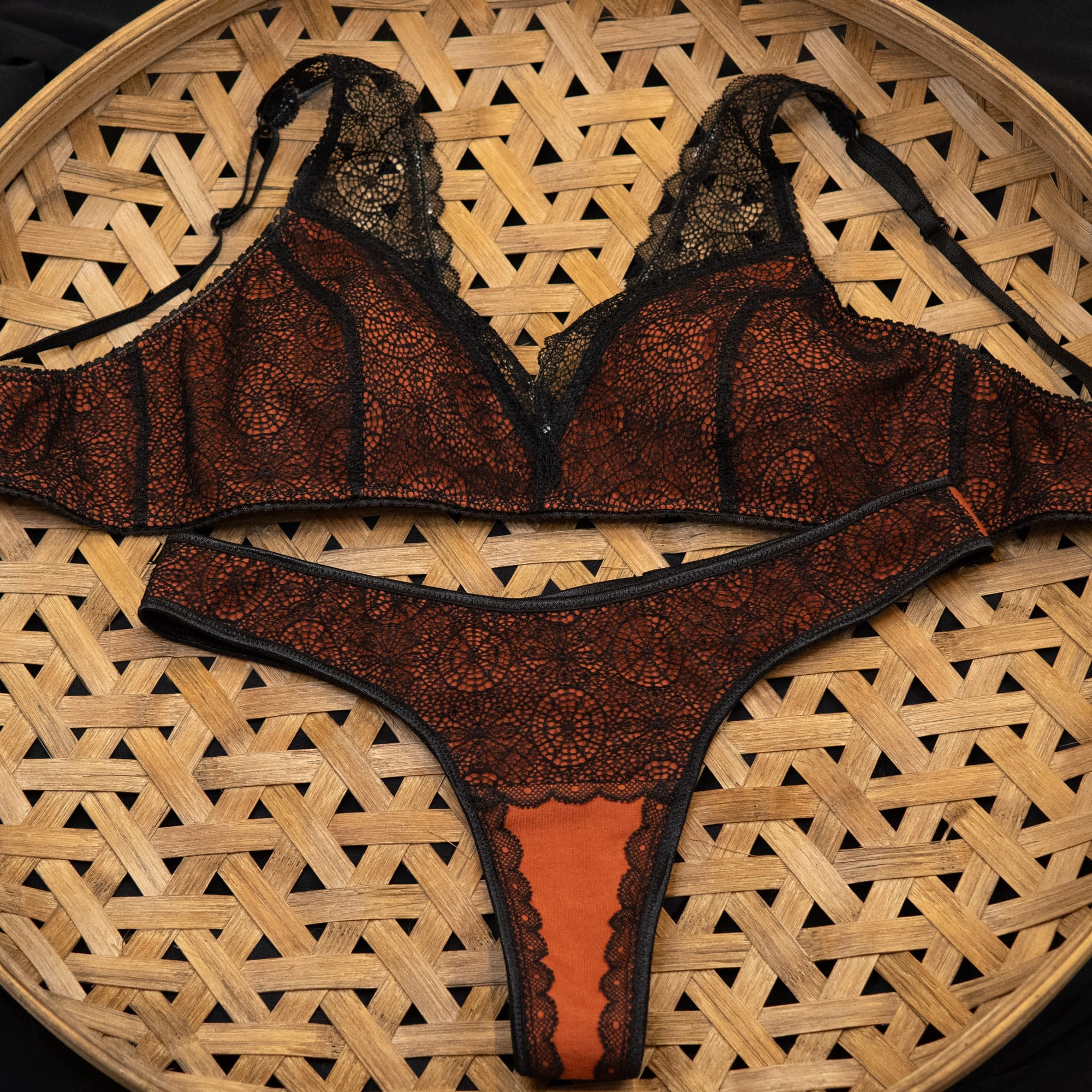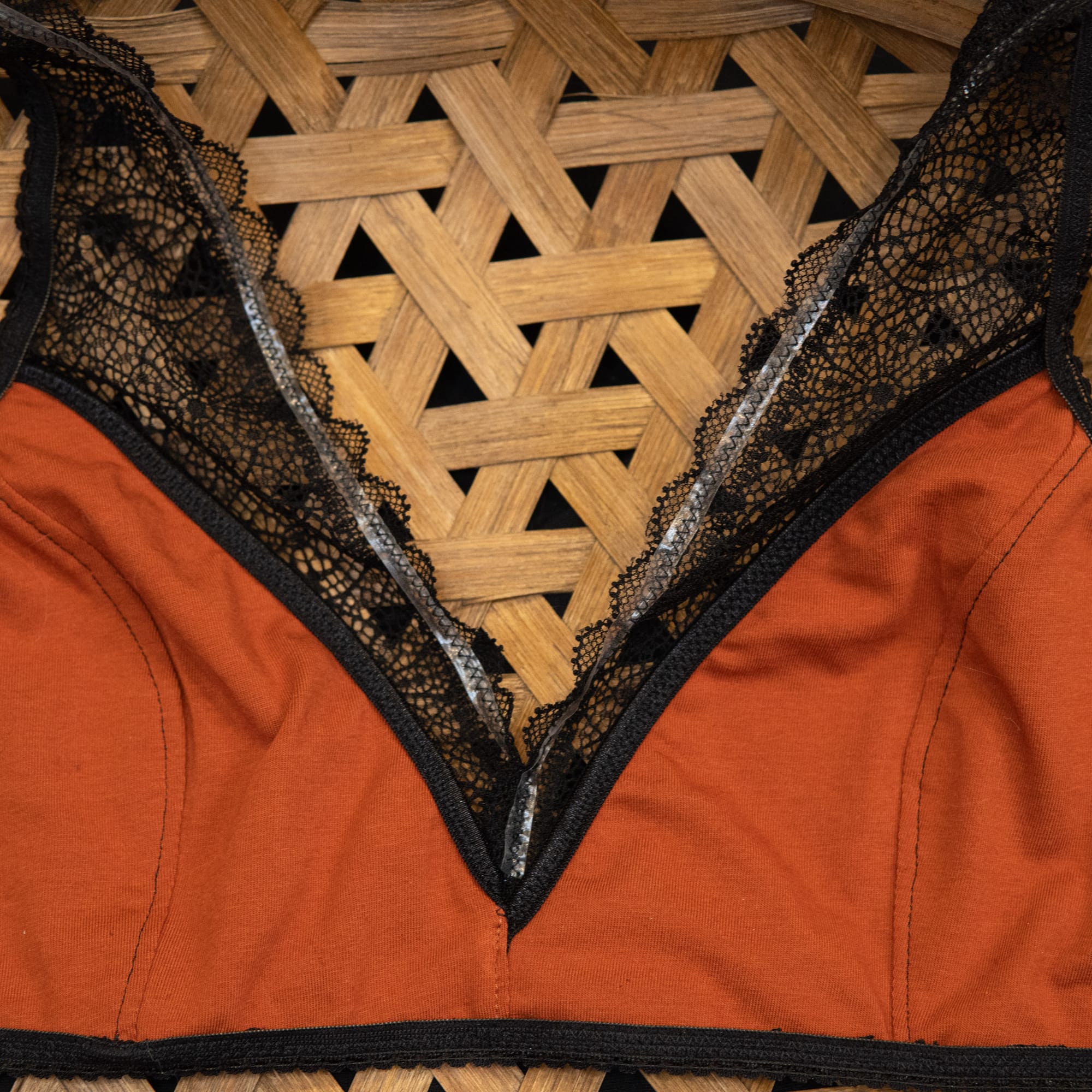 To match the bralette, I decided to draft a thong pattern. It’s a very simple pair of underwear that I used as a canvas for fitting in pieces of leftover lace. I ordered 2 yards of lace, which was not quite enough for a set. I had tiny scraps that I was able to either sew in or use as appliques over the orange jersey fabric, which looks intentional...but I spent way too long piecing lace scraps together haha.